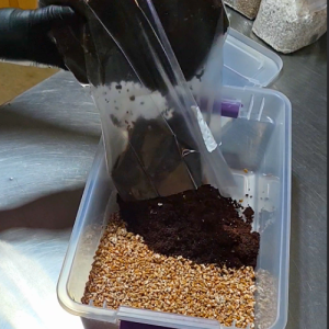- Preparing Your Substrate: Mix and break apart your colonized rye grain inside the bag thoroughly. Cut open the bag with sanitized scissors and empty the contents into one side of a 15-quart tub. Next, empty roughly half of your CVG substrate into the empty half of the tub. (You’re aiming for a ratio of about a 1-to-1 CVG to spawn.)