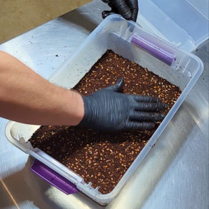 - Combining the Rye and CVG: Mix well with your hands, evenly distributing the grain throughout the tub. Gently pat down the surface to make it level. Once level, carefully tap down the edges with your fingers to close up the air gaps between the substrate and the side of the tub. This helps prevent side pins. (Note: Side pins get a bit of a bad rap. There is nothing wrong with them other than the hassle of harvesting them.)