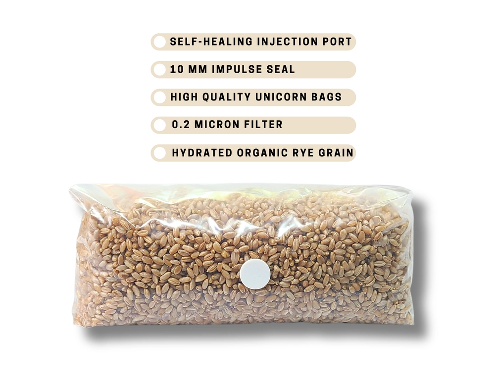 We soak our top-tier organic rye berries in a gypsum solution for 24 hours. Subsequently, we transfer these grains to premium Unicorn Bags. We fill every bag with 5 pounds of optimally hydrated rye grain. Each medium rye grain bag is equipped with a self-healing injection port (SHIP) and a 0.2 micron filter patch. To guarantee pristine, uncontaminated grain, bags are pressure-cooked at 17 PSI for 2.5 hours. We wrap up the process by sealing each bag under a laminar flow hood.