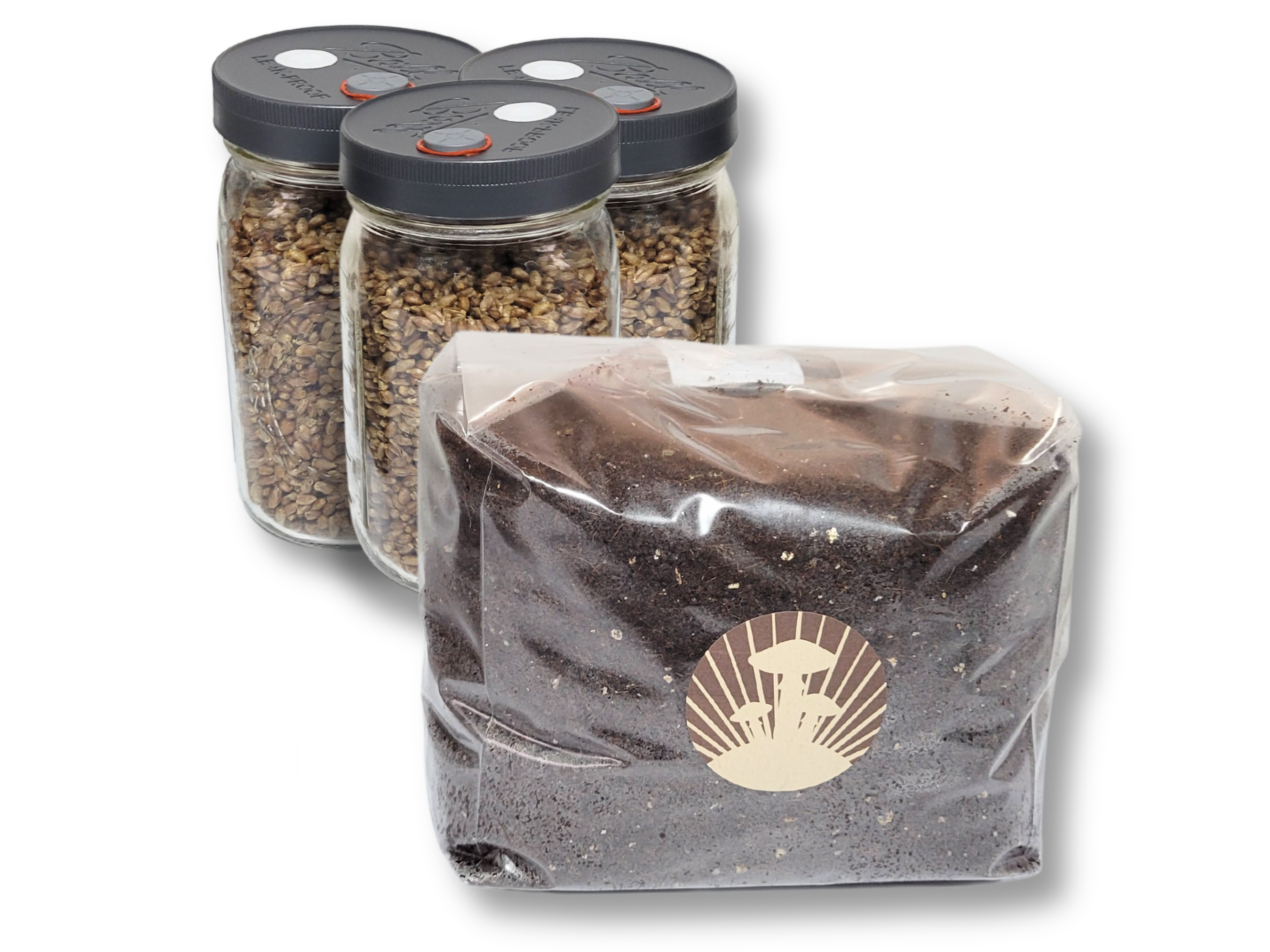 This enhanced rye jar + CVG combo pack brings together two fundamental components for mushroom cultivation: 6 pounds of our CVG Mushroom Substrate and three quart jars, each containing 1 lb of our premium organic rye grain. This combo is crafted for both novices and seasoned cultivators, offering a comprehensive approach to mushroom cultivation that promotes both high yields and exceptional quality.